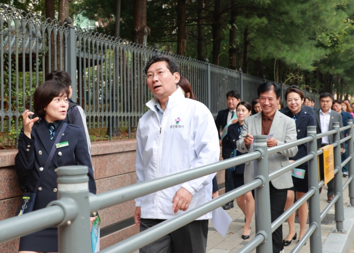 이 시장은 학부모들과 함께 통학로 주변을 둘러보며 시설을 점검하면서 ▲대청초 후문 좁은 인도에 풀이 우거져 보행을 방해하는 화단과 파손된 보도블록 정비 ▲인도와 차도의 경계가 없는 구간 볼라드 설치 ▲진흥더블파크 옆 가파른 경사와 급커브 구간 방지턱 추가 설치 ▲학교 주변 일부 보도블럭 교쳬 등을 지시했다.