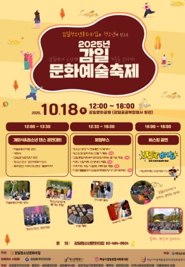 [무한뉴스=박노신 기자] 하남시 감일청소년문화의집은 오는 10월 18일 오후 12시부터 18시까지 감일문화공원(감일공공복합청사 뒷편)에서 '제2회 감일문화예술축제'를 개최한다.