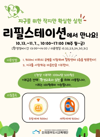 [무한뉴스=정승훈 기자] (재)의정부도시교육재단은 10월 13일부터 11월 7일까지 매주 월요일부터 금요일, 오전 10시부터 오후 5시까지 힐링센터 2층에서 생활 속 친환경 실천 활동 ‘리필스테이션’을 운영한다.