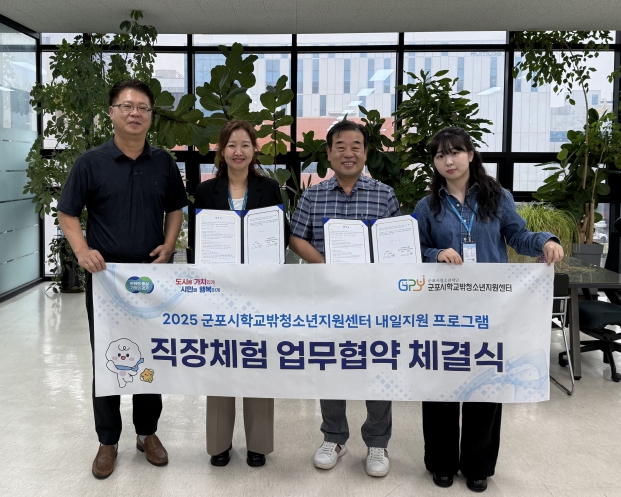 [무한뉴스=손성기 기자] 군포시청소년재단(대표이사 김덕희), 군포시학교밖청소년지원센터(센터장 강연미)는 시각디자인 분야로의 진학과 진로를 희망하는 학교 밖 청소년을 지원하기 위해 관내 디자인 전문업체인 ㈜은진과 직장체험 업무협약을 체결했다고 밝혔다.