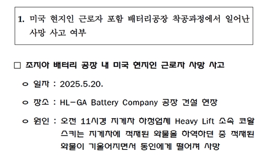 이 의원실이 확보한 현지 정보에 따르면, 해당 공장 건설 과정은 하청·재하청 구조로 인해 안전관리 체계가 크게 약화됐으며, 미국 산업안전보건청(OSHA)에 보고된 산업재해만 70건이 넘었다고 한다. 불법체류 노동자들이 추방을 우려해 신고하지 못한 경우까지 감안하면 실제 사고 건수는 훨씬 많을 것으로 추정된다.