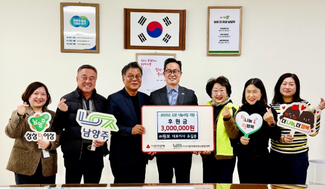 [무한뉴스=정승훈 기자] 남양주시는 29일 ㈜원보(대표이사 유길문)가 다산1동 지역사회보장협의체(위원장 정순옥)에 김장 나눔 사업비로 300만 원을 지정기탁했다고 밝혔다.