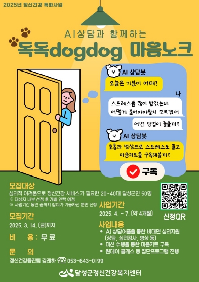 [무한뉴스=최진수 기자] 달성군보건소는 이달부터 7월까지 달성군정신건강복지센터 정신건강증진사업의 일환으로 AI 상담과 함께하는 ‘독독dogdog 마음노크’ 운영한다고 밝혔다.