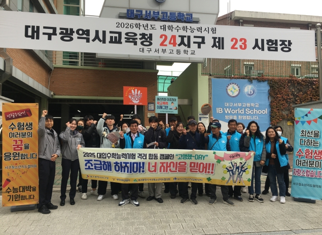 [무한뉴스=최진수 기자] 대구 서구 청소년지도협의회(회장 황만태)는 지난 12일, 서부고등학교 정문에서 학생들의 수능 예비 소집일 시간에 맞춰 수험생 응원 및 선도·보호 합동 캠페인을 실시했다.