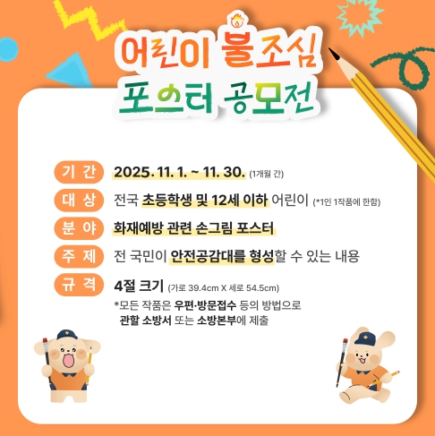 [무한뉴스=정민정 기자] 해남소방서가 11월 불조심 강조의달을 맞아 이달 21일까지 지역 내 초등학생 및 12세 이하 어린이를 대상으로 불조심 포스터 공모전을 개최한다.