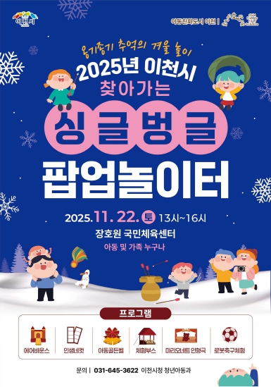 [무한뉴스=정충근 기자] 이천시는 아동친화도시 놀이문화 확산과 아동의 놀권리 보장을 위해 『찾아가는 싱글벙글 팝업 놀이터‘겨울놀이’』행사를 오는 11월 22일 장호원 국민체육센터에서 개최한다고 밝혔다.