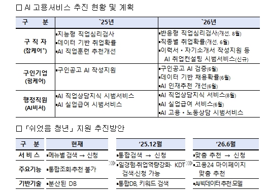 또한 정책 사각지대인 “쉬었음 청년”을 체계적으로 지원하기 위하여 각종 고용행정데이터를 활용하여 고용24 내 청년 데이터베이스를 확충하고 지역·진로유형·희망직종에 따른 맞춤 프로그램을 자동 추천할 예정이다.
