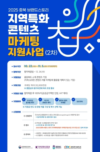 이번 사업은 충청북도의 지역 자원과 특화 소재를 기반으로 한 콘텐츠 기업의 브랜드 경쟁력 강화 및 판로 확대를 지원하기 위해 추진된다. 선정된 기업은 오프라인 홍보물 제작, 미디어 콘텐츠 제작, 콜라보 협력 마케팅, 판로 개척 등의 분야에서 다양한 지원을 받을 수 있다.