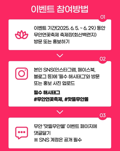 참여 방법은 이벤트 기간에 축제장(회산백련지) 방문 인증샷을 찍거나 무안군 공식 SNS에 게시된 축제 홍보 게시물을 리그램 또는 공유한 뒤, 개인 SNS에 필수 해시태그(#무안연꽃축제, #맛뜰무안몰)를 포함해 게시한 후, 맛뜰무안몰 이벤트 페이지에 댓글을 작성하면 된다.