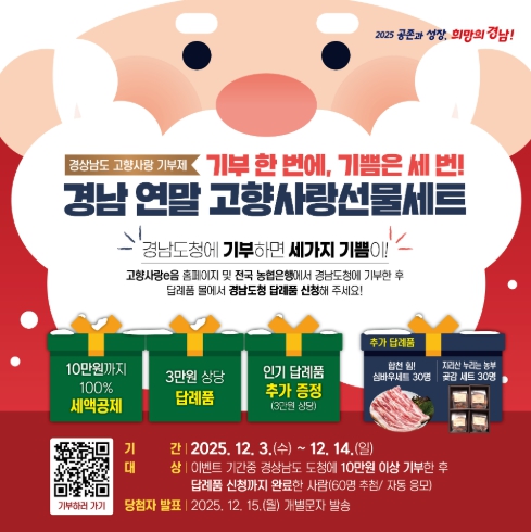 [무한뉴스=최진수 기자] 경상남도는 연말정산 시즌을 맞아 12월 3일부터 14일까지 12일간 ‘고향사랑기부제 연말 특별 이벤트’를 진행한다.