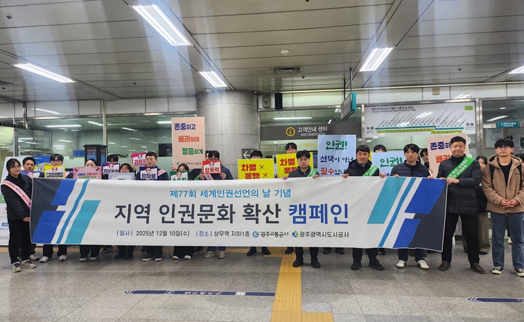 [무한뉴스=정민정 기자] 광주도시공사(사장 김승남)는 지난 10일 서구 상무역에서 광주교통공사와 합동으로 인권문화 존중 캠페인을 펼쳤다고 밝혔다.