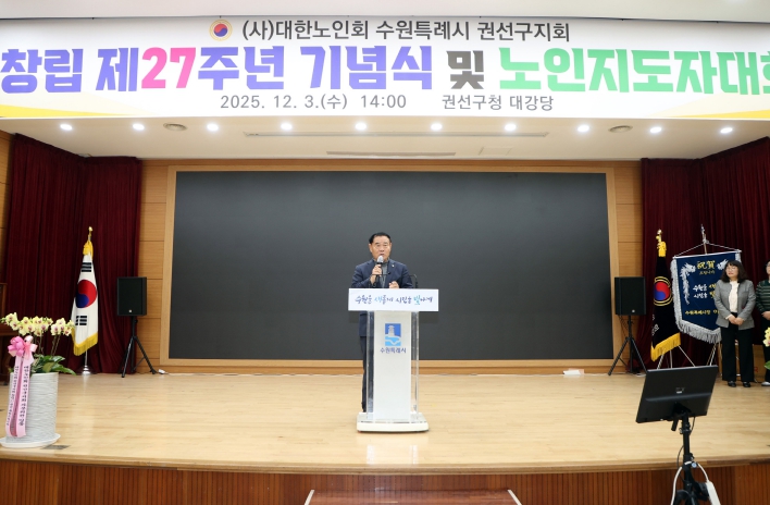 [무한뉴스=양현명 기자] 수원특례시의회는 3일 권선구청 대회의실에서 열린‘대한노인회 수원시 권선지구 제27주년 기념식 및 노인지도자대회’에 참석해 어르신 지도자들의 노고를 축하하고 격려했다.