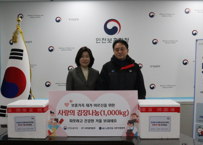 [무한뉴스=정승훈 기자] 국가보훈부 인천보훈지청은 12월 3일 KT서부광역본부 후원으로 관내 거주 저소득 보훈 가족 100가구에 김장김치 1000kg을 전달했다.