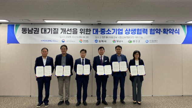 [무한뉴스=최진수 기자] 경남도는 23일 낙동강유역환경청 대회의실에서 효성중공업(주), 낙동강유역환경청, 김해시, 양산시, 함안군과 함께 『대·중소기업 지역대기질 개선 상생협력 사업 연도별 참여 확약식』을 체결했다고 밝혔다.