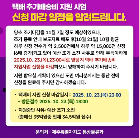 [무한뉴스=정민정 기자] 제주특별자치도는 택배 추가배송비 지원 사업이 당초 11월 7일 종료 예정이었으나, 신청 급증으로 10월 23일 오후 11시(방문 접수 오후 6시)에 조기 종료된다고 밝혔다.