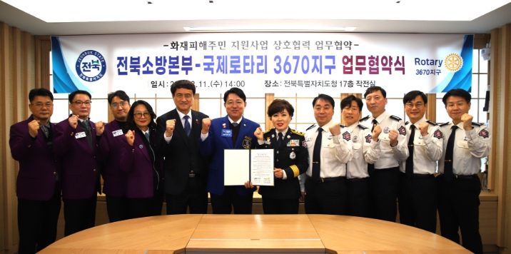 [무한뉴스=정민정 기자] 전북특별자치도소방본부는 11일 국제로타리 3670지구(총재 김성희)와 화재피해주민 지원사업의 원활한 추진을 위한 상호협력 업무협약을 체결했다고 밝혔다.