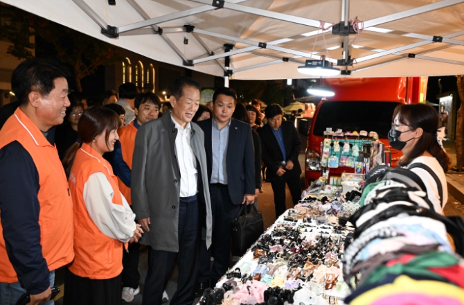 | ▲ 25일 서동욱 남구청장이 남구청사거리에서 남울산우체국까지 이어진 왕생이길에서 열린 왕생로 아트온 페스티벌에 참석해 플리마켓을 둘러보며 소상공인을 격려하고 있다. |