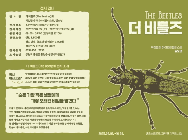 [무한뉴스=정민정 기자] 홍천생명건강과학관 2025년 기획전시 『더비틀즈(The Beetles』가 9월 6일부터 10월 26일까지 홍천생명건강과학관 1층 기획전시실에서 개최된다.