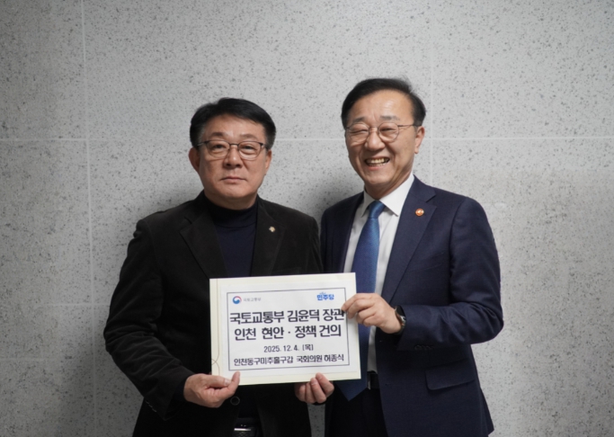 [무한뉴스=양현명 기자] 더불어민주당 허종식 의원(국회 기후에너지환경노동위·인천 동구미추홀구갑)이 4일 국회에서 김윤덕 국토교통부 장관을 만나 ‘인천 지역 국토·교통 현안 건의서’를 전달하고, 정부 차원의 적극적인 대책 마련을 촉구했다.