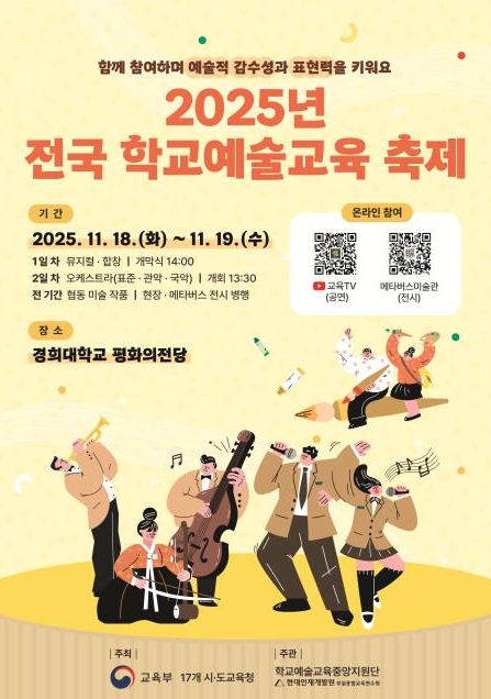 [무한뉴스=정승훈 기자] 교육부와 17개 시‧도교육청은 11월 18일부터 11월 19일까지 경희대학교 평화의전당(서울)에서 2025년 전국 학교예술교육 축제를 개최한다.
