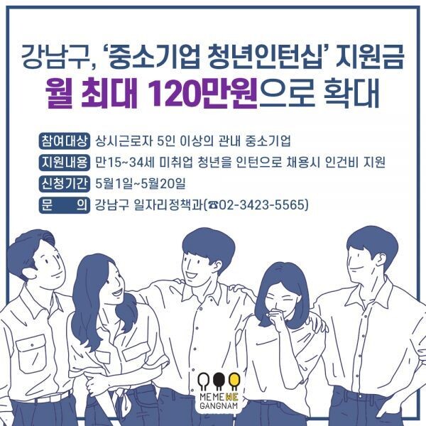 [무한뉴스]‘기분 좋은 변화, 품격 있는 강남’을 구현 중인 강남구가 코로나19로 피해를 입은 기업의 고용 안정을 위해 1일부터 ‘중소기업 청년인턴십’ 참여사 지원금을 인턴 1인당 월 최대 120만원으로 확대한다.
