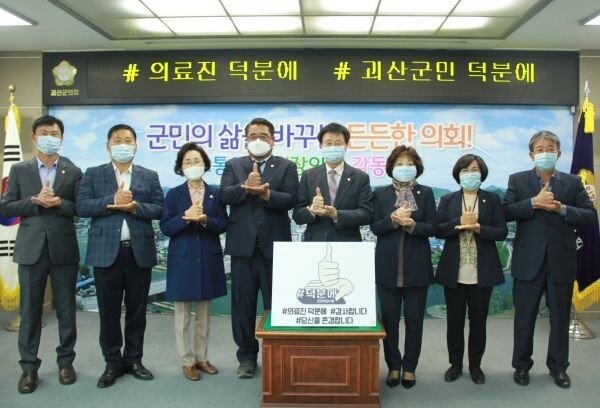 앞서 ‘덕분에 챌린지’에 참여한 이차영 괴산군수의 다음 주자로 지목 받은 신동운 의장을 비롯한 8명의 괴산군의회 의원들은 이날 함께 모여 의료진에게 존경과 감사의 마음을 전했다.