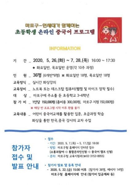 [무한뉴스] 마포구는 ‘마포구-연세대학교가 함께하는 온라인 초등학생 중국어 프로그램’을 5월 26일부터 7월 30일까지 10회에 걸쳐 진행한다고 밝혔다.