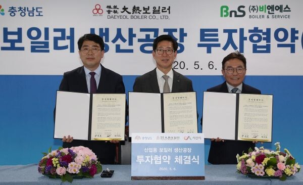 양승조 충남지사는 6일 도청에서 맹정호 서산시장, 대열보일러 신국호 대표, 비엔에스 장영순 대표와 투자협약을 체결했다.