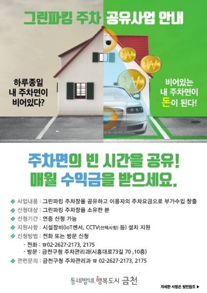 유성훈 금천구청장은 “그린파킹과 주차공유사업을 통해 주택가 주차난 해소뿐 아니라 주차장 소유주는 주차장이 빈 시간을 활용해 수입을 얻고 사용자는 저렴하고 편리하게 주차장을 이용할 수 있는 일석삼조의 효과를 거둘 수 있을 것으로 기대하고 있다”고 말했다.