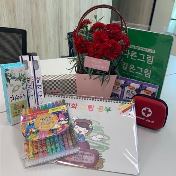 ‘인지활동 관심 꾸러미’는 비대면 쉼터 프로그램 운영의 일환으로 어버이날 카네이션 워크북 구급함 위생용품 등으로 구성되어 있다.