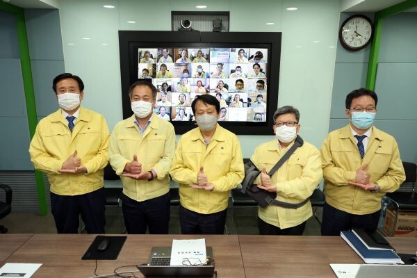 이성 구청장은 영상회의실에서 각 부서장은 각자의 자리에서 수어로 의료진에 대한 고마움을 전했다.