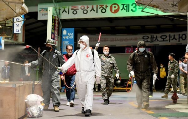 화지시장 영업 시간이 종료된 저녁에 모인 회원들은 고압분무기 등을 이용, 코로나19로부터 시민의 안전과 생명 지키기 위한 철저한 방역소독에 돌입했다.