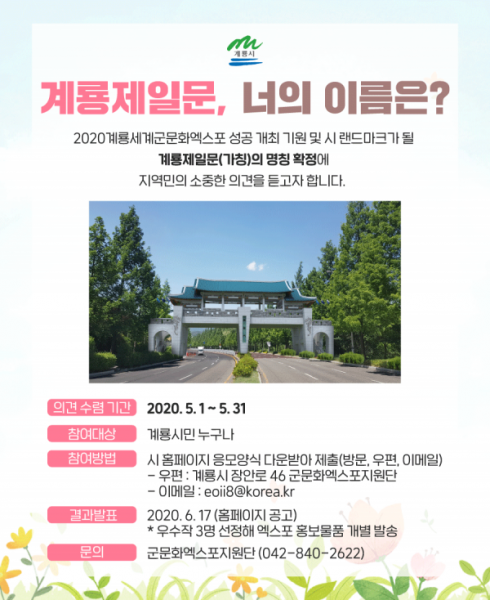 시는‘2020계룡세계軍문화엑스포’의 성공적인 개최를 기원하고 국방도시의 랜드마크가 될 ‘계룡제일문’에 지역적 특성을 반영하고 시민들이 직접 참여하는 기회를 제공하기 위해 의견수렴 과정을 거치기로 했다.