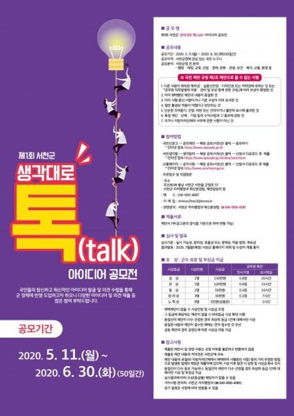[무한뉴스] 서천군이 군정 발전을 위한 다양하고 참신한 아이디어 발굴을 위해 제1회 ‘생각대로 톡’ 아이디어 공모전을 개최한다.
