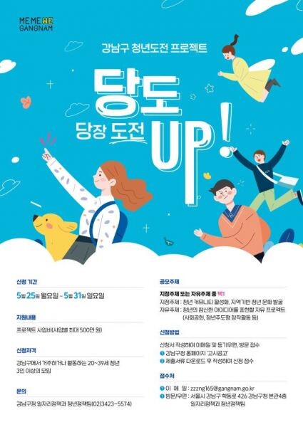 [무한뉴스] ‘기분 좋은 변화, 품격 있는 강남’을 구현 중인 강남구가 참신한 아이디어를 통해 지역사회 문제를 해결하기 위한 청년도전 프로젝트 ‘당도 up’ 참여자를 이달 25일부터 31일까지 모집한다.