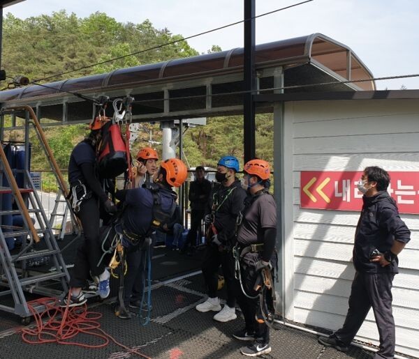 이번 안전 교육에는 한국하강레저협회 최규혁 팀장 외 전문 인력 2명이 강사로 참여했으며 짚와이어 담당 공무원 및 운영요원 13명에 대한 교육을 진행했다.