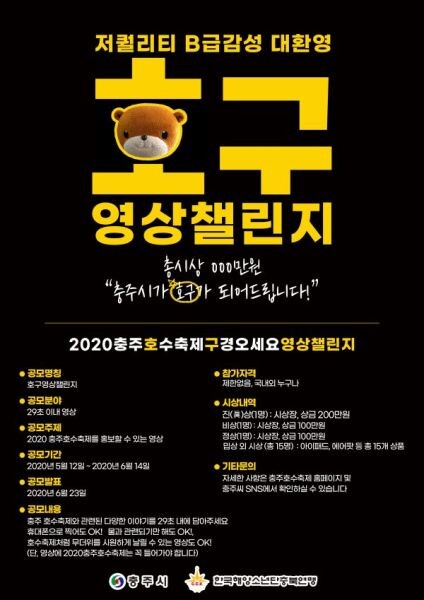 [무한뉴스] 한국해양소년단충북연맹은 오는 6월 14일까지 ‘2020 충주호수축제’ 홍보를 위한 ‘호구영상 챌린지’를 개최한다고 13일 밝혔다 이번 공모전은 충주호수축제에 대한 시민들의 적극적인 관심을 유도하고 창의적인 아이디어를 발굴하기 위해 마련됐다.