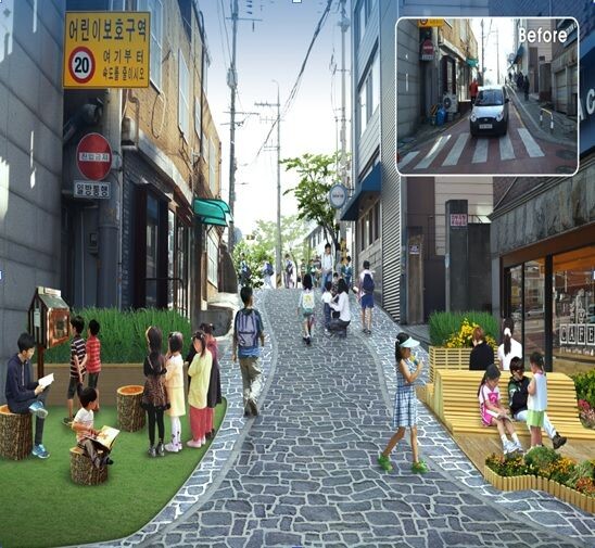 이에 구는 먼저 차선을 없애고 우중충한 아스팔트 도로 전체에 친환경 차도블록을 설치해 아이들 친화공간으로 쾌적하게 바꾼다.