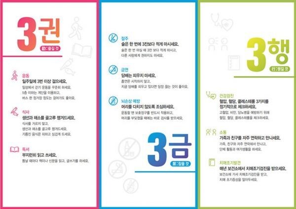 주요 내용은 3권 운동·식사·독서 즐기기 3금 술·흡연은 줄이고 머리를 다치지 않게 조심하기 3행 건강검진, 치매 조기발견, 가족·친구들과의 소통 챙기기 등이다.