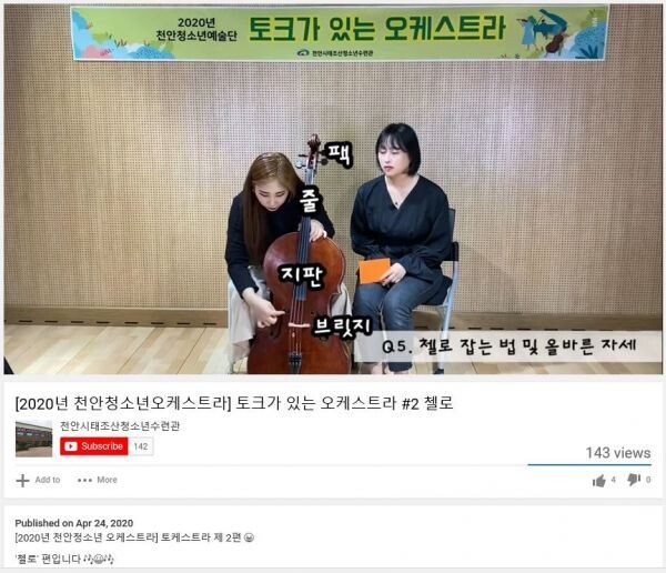 먼저 천안청소년합창단과 천안청소년오케스트라로 구성된 ‘2020 천안청소년예술단’이 대면활동이 어려운 청소년들을 위해 집에서 보고 배울 수 있는 온라인 강습을 지원한다.