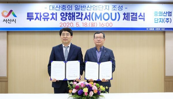 이날 맹정호 서산시장과 김종대 충의산업단지㈜ 대표는‘대산충의 일반산업단지 조성’의 안정적 사업추진 지원으로 준공을 완료하는 것과 지역경제 활성화에 이바지하는 것을 골자로‘투자유치 양해각서’에 서명했다.