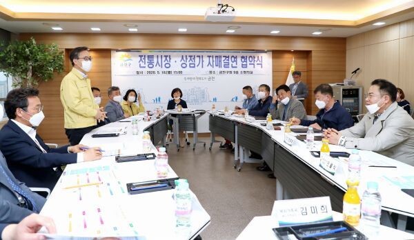 [무한뉴스] 금천구가 코로나19로 침체된 지역경제 활력 회복을 위해 지난 18일 오후 3시 구청 소희실에서 구청 7개 국과 지역 7개 전통시장 및 상점가 간 자매결연 협약을 체결했다.