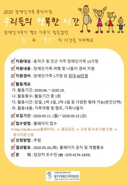 장애인가족의 ‘쉼’과 ‘충전’의 시간을 제공하기 위해 개별단위가족의 여행 및 캠프 당일나들이 경비 지원 등으로 진행하며 오는 22일까지 관내 장애인가족 13팀을 모집한다.