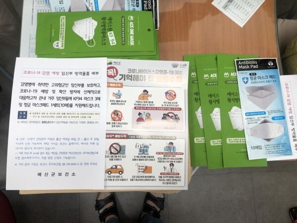 [무한뉴스] 예산군보건소는 코로나19 등 감염병에 취약한 고위험군인 관내 임신부 155명을 대상으로 충남도에서 지원받은 KF94 마스크 및 항균 마스크 패드 등 방역물품을 추가 배부했다고 20일 밝혔다.