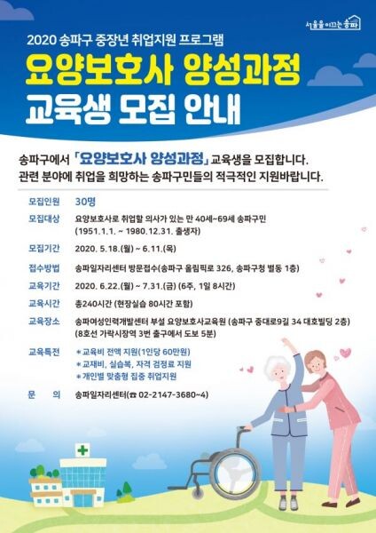 ‘송파구 요양보호사 양성교육’ 모집 대상은 요양보호사로 취업할 의사가 있는 만 40세~69세 송파구민이다.