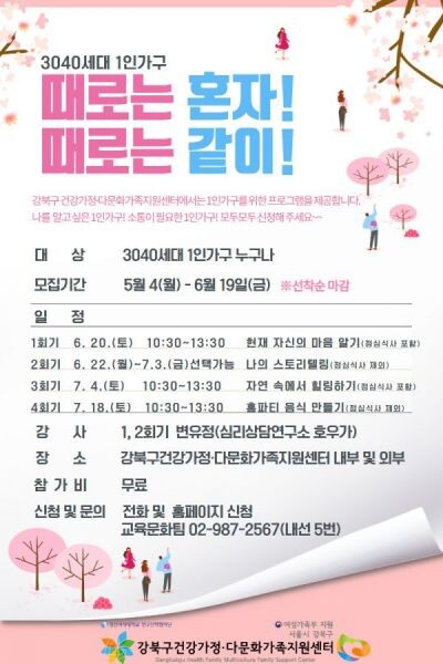 [무한뉴스] 강북구는 강북구건강가정·다문화가족지원센터 주관으로 3040세대 1인가구를 위한 자기돌봄 프로그램 ‘때로는 혼자 때로는 같이’를 운영한다.