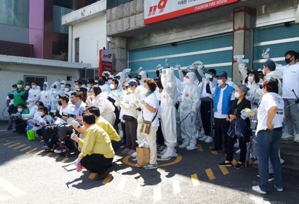 특히 이태원1동의 경우 이태원관광특구연합회 소속 상인들이 100여명 참여, 이태원 거리와 상가, 공용시설물 일대를 두루 방역했다.