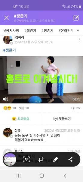 '생존기' 게시판에는 1년치 먹을 마늘까기, 아이와 함께 만든 수제 우엉차, 어느 맑은 날 자전거로 한강 산책, 홀로 뒷산 정복, 옥상텃밭 가꾸기 등 다양한 코로나19 생존법과 사진이 게시돼 회원들에게 소소한 일상의 재미를 더해 주고 있다.
