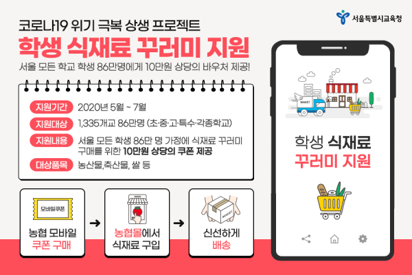 모바일 쿠폰은 학부모 휴대전화 번호로 발송될 예정이며 식재료는 주문을 통해 5월 말부터 각 가정으로 배달되게 된다.