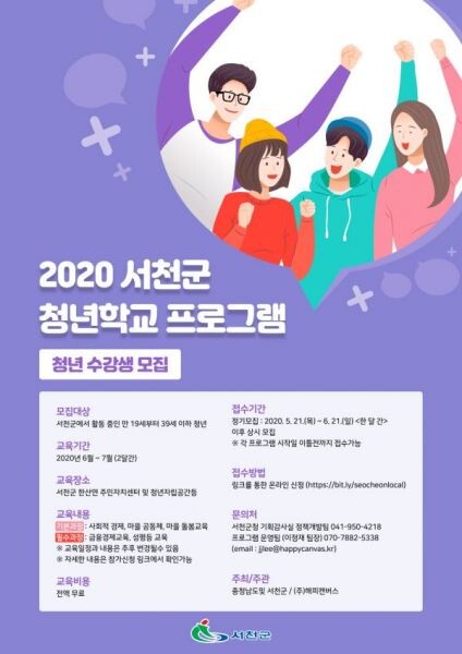 청년학교는 충청남도와 서천군의 공동으로 주관하는 사업으로 전문 강사를 초빙해 사회적 경제 교육을 비롯해 퍼실리테이터와 함께하는 마을 공동체 교육, 사람을 이끄는 대화법 강의 등이 진행된다.